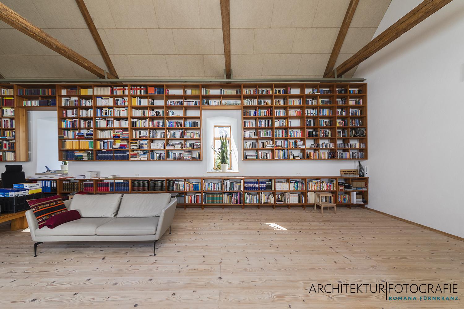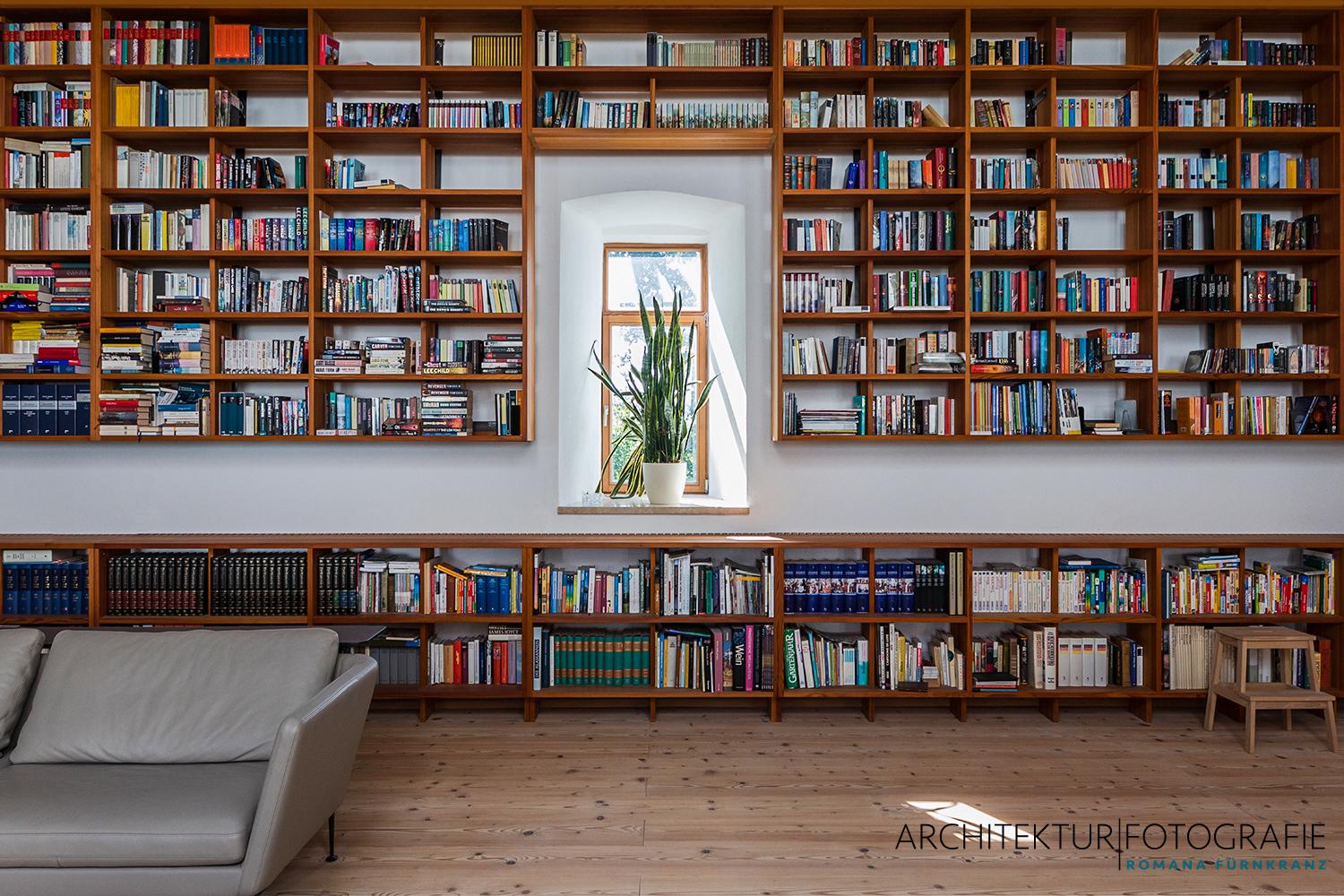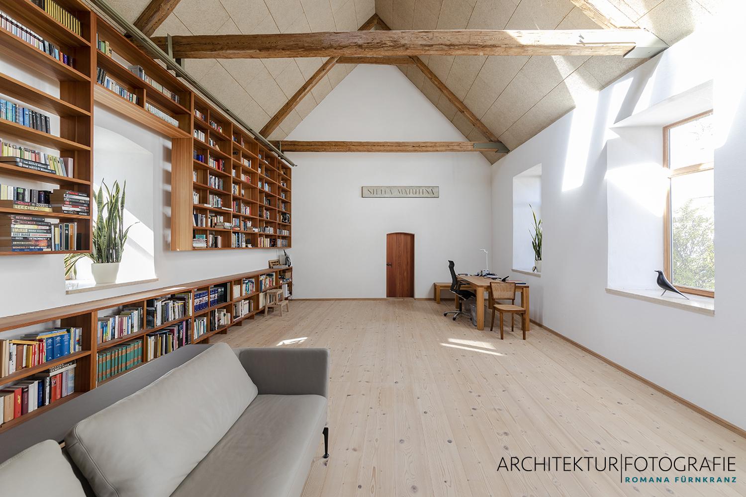 Auf den kargen, archaisch anmutenden Hochflächen des nördlichen Waldviertels entstand dieser diskrete Rückzugsort, der nach außen hin mit keiner Silbe verrät, dass hier nicht mehr Ochs‘ und Kuh im Stall stehen, sondern eine stolze, 4000 Bände umfassende Bibliothek. Ein auf derlei ungewöhnliche Umbauten im Bestand spezialisierter Architekt bewältigte die knifflige Aufgabenstellung, aus der ehemaligen Mehlkammer einen Zugang zum Wohnbereich zu gestalten und zugleich die loftartige Bibliothek zu erschließen. Der Raum präsentiert sich heute im historischen Look, als hätte es ihn schon immer gegeben…