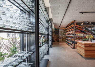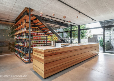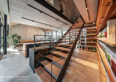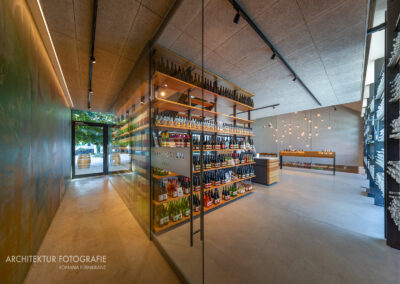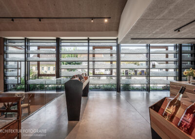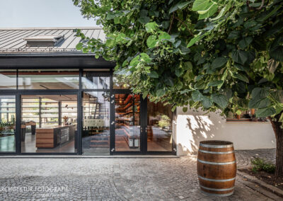 Der zur Straßenseite stimmig ins Ortsbild eingegliederte, geduckt wirkende Baukörper mit interessanter Gasfassade erweist sich innen als wahres Raumwunder – unter dem Giebel hat sogar eine Empore Platz gefunden, wo das Büro des traditionsreichen Weinviertler Weinguts untergebracht ist.
