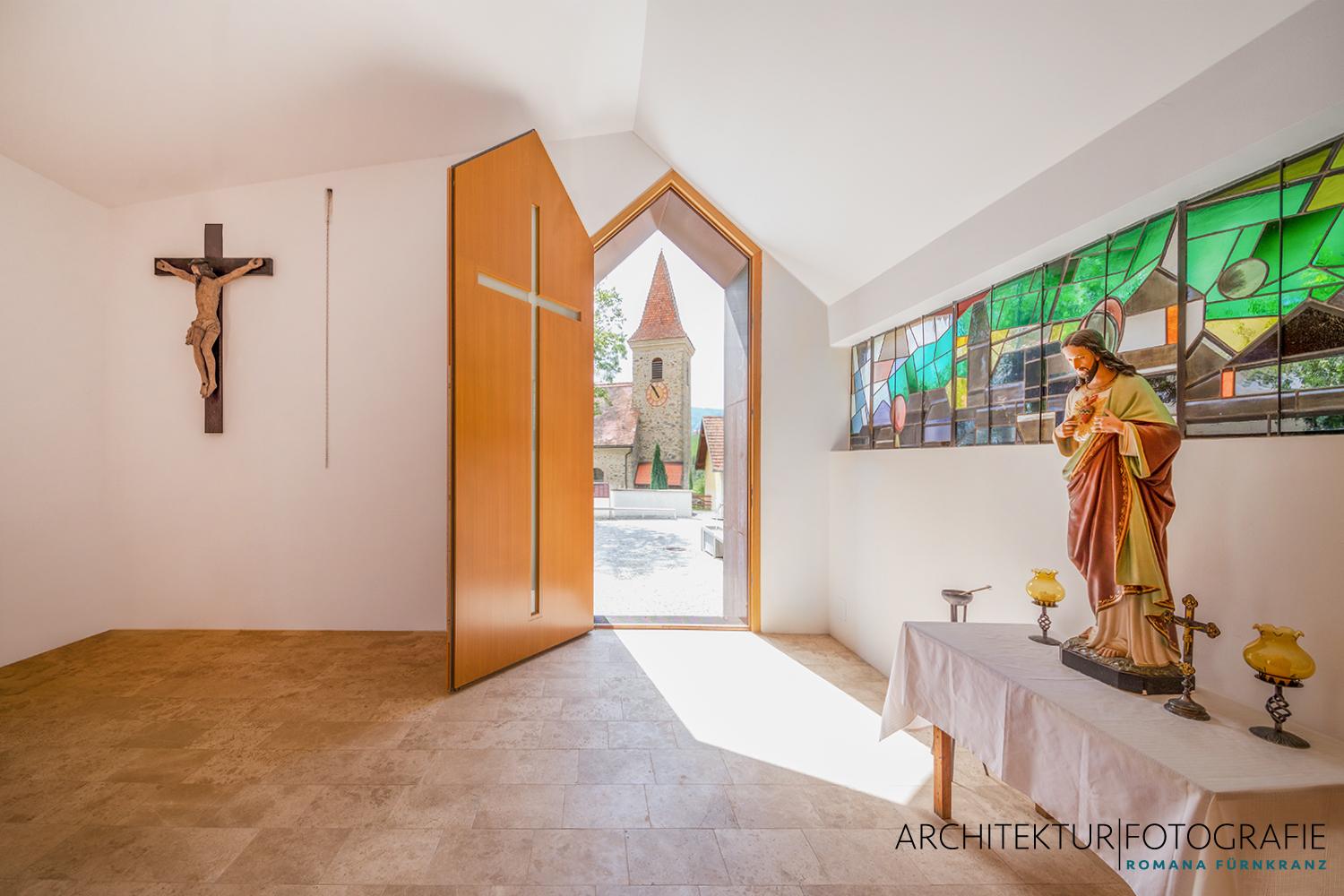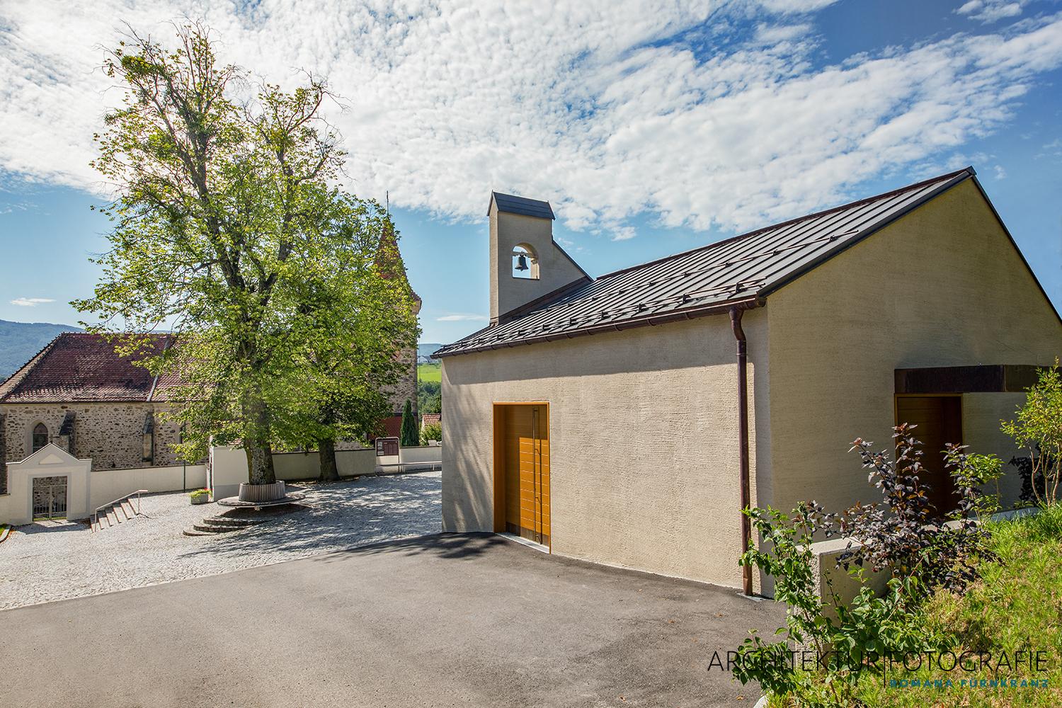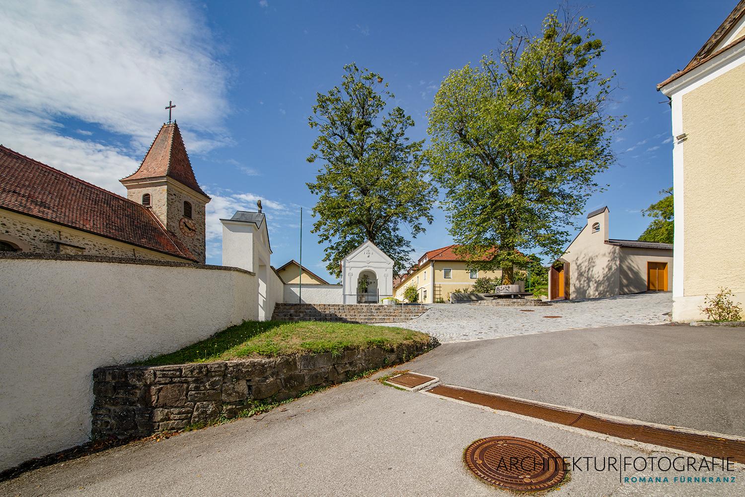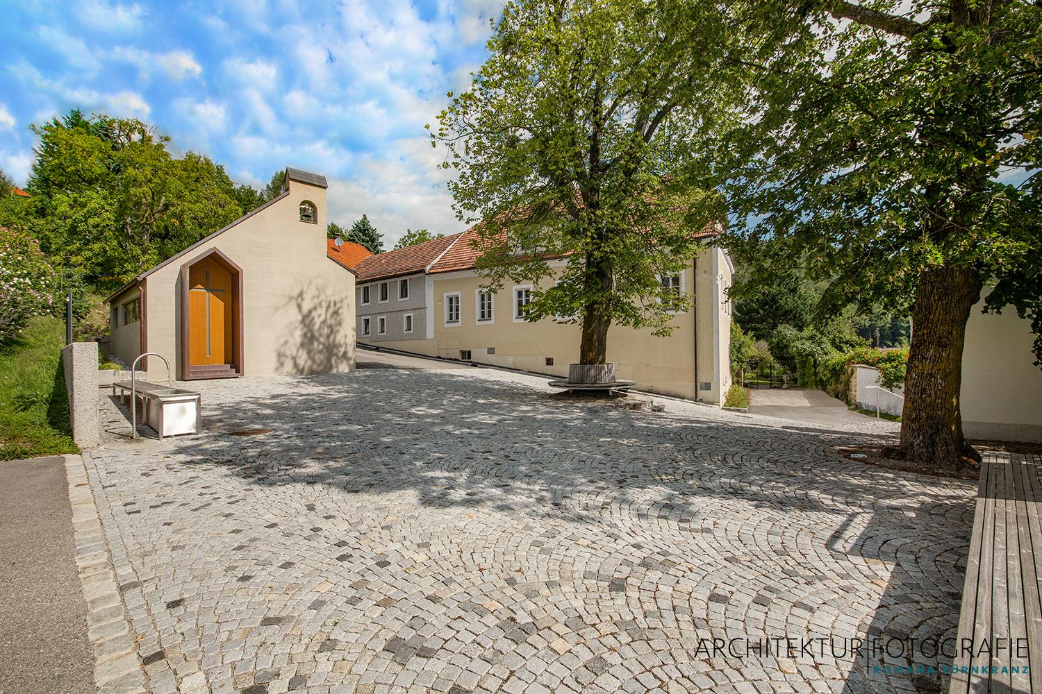 In der Wienerwaldgemeinde Brand-Laaben initiierte die Gemeinde die Umgestaltung des Kirchenplatzes und der angrenzenden Aufbahrungshalle. Eine bestehende Nische wurde geöffnet und macht nun einem skulpturenhaften Tor Platz, das von innen dem Blick auf die gegenüberliegende Kirche einen interessanten Rahmen verleiht. Der ursprünglich L-förmige Bau wurde geschlossen, wodurch Raum für öffentliche Toiletten entstand. Der Platz selbst mit seinem neuen Pflaster, gemütlichen Sitzgelegenheiten und einem Brunnen hat jetzt einen Hauch von mediterranem Flair.
