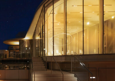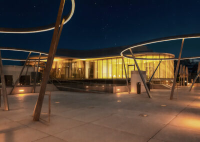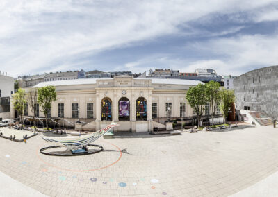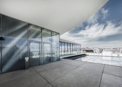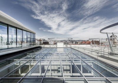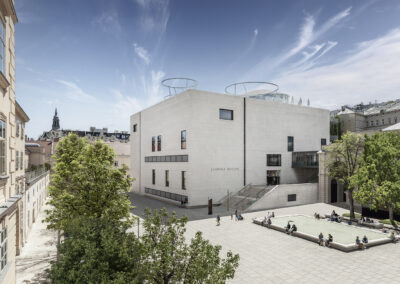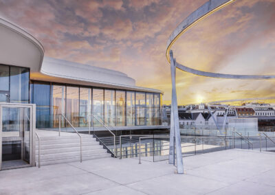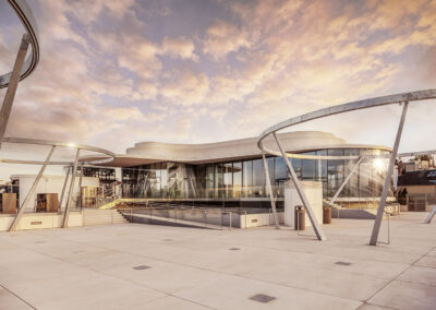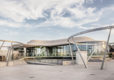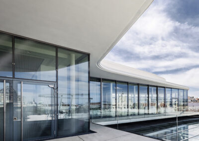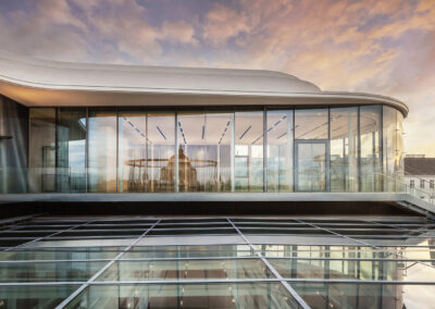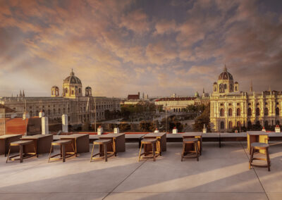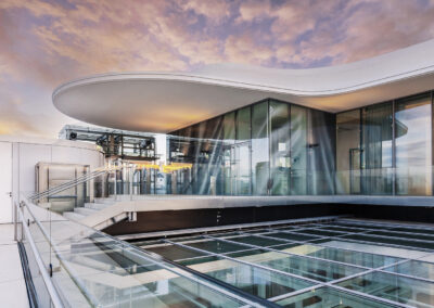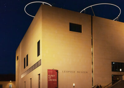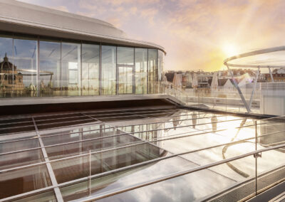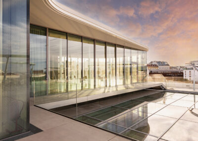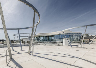 Die schwungvolle „Libelle“, ein Pavillon auf dem Dach des Leopoldmuseums im Wiener Museumsquartier, ist ein neues architektonisches Highlight der Wiener Innenstadt mit prachtvollem Ausblick, der über einen Glaslift – auch für die Öffentlichkeit – zugänglich ist und Platz für Ausstellungen und Veranstaltungen bietet.
