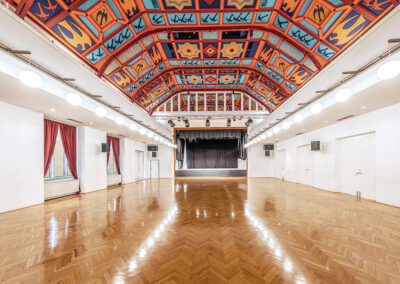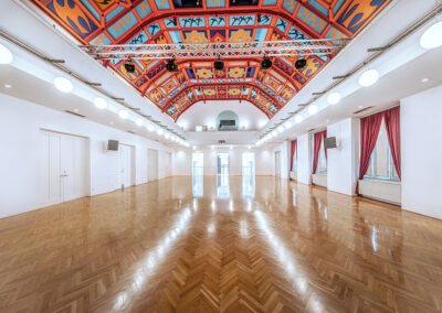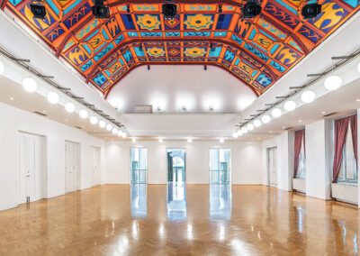 Die Decke des großen Saals wurde mit Malereien von Maria Biljan-Bilger ausgestattet.